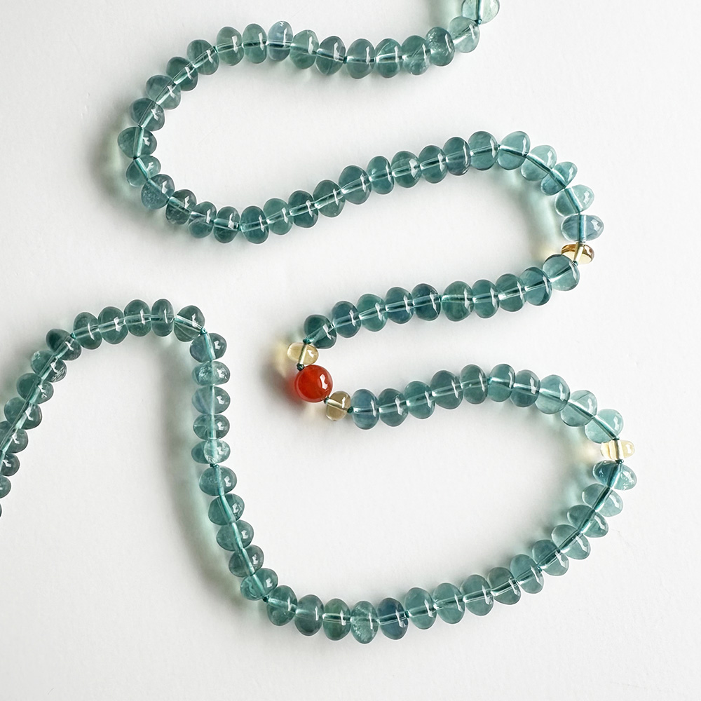 When you wear this necklace, the body’s natural downward-moving energy flows are supported and strengthened by the Blue-Green Fluorite. Blockages in these flows are naturally cleared with the help of the Citrine and Carnelian, and excess energy that may have accumulated is then dissipated.