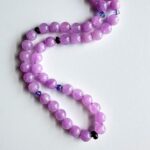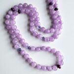 In the Master Healer design, five Sugilite and four Tanzanite are separated by five, six, or eight Lavender spheres. The number chosen depends on the desired necklace length and bead size. In this case, the energy of the number five would support creative manifestation of one's better health, six would support improved self-mastery of one's health, and the number eight would support evolution toward greater health. We decided that our stock necklaces would have eight beads; special orders and upgrades can have fewer.