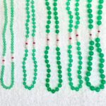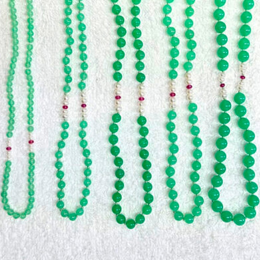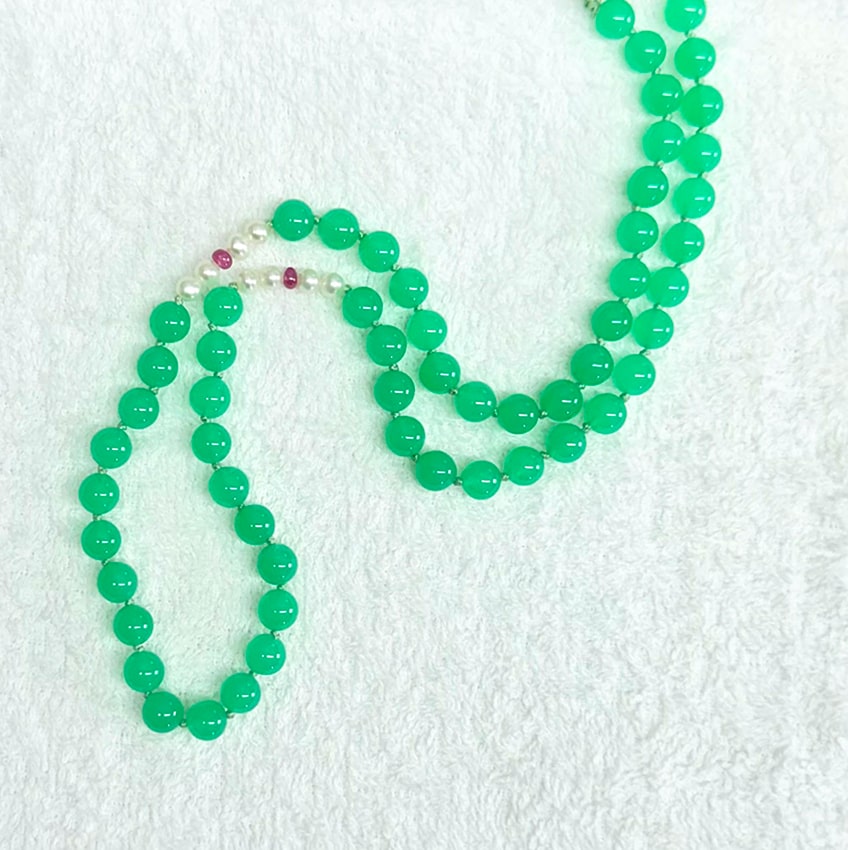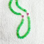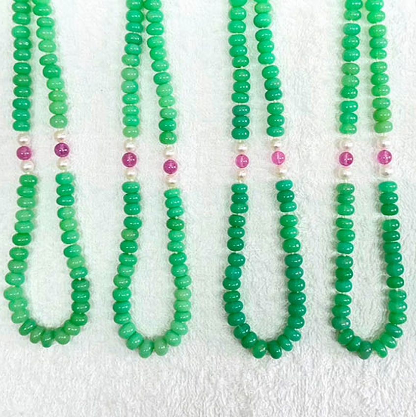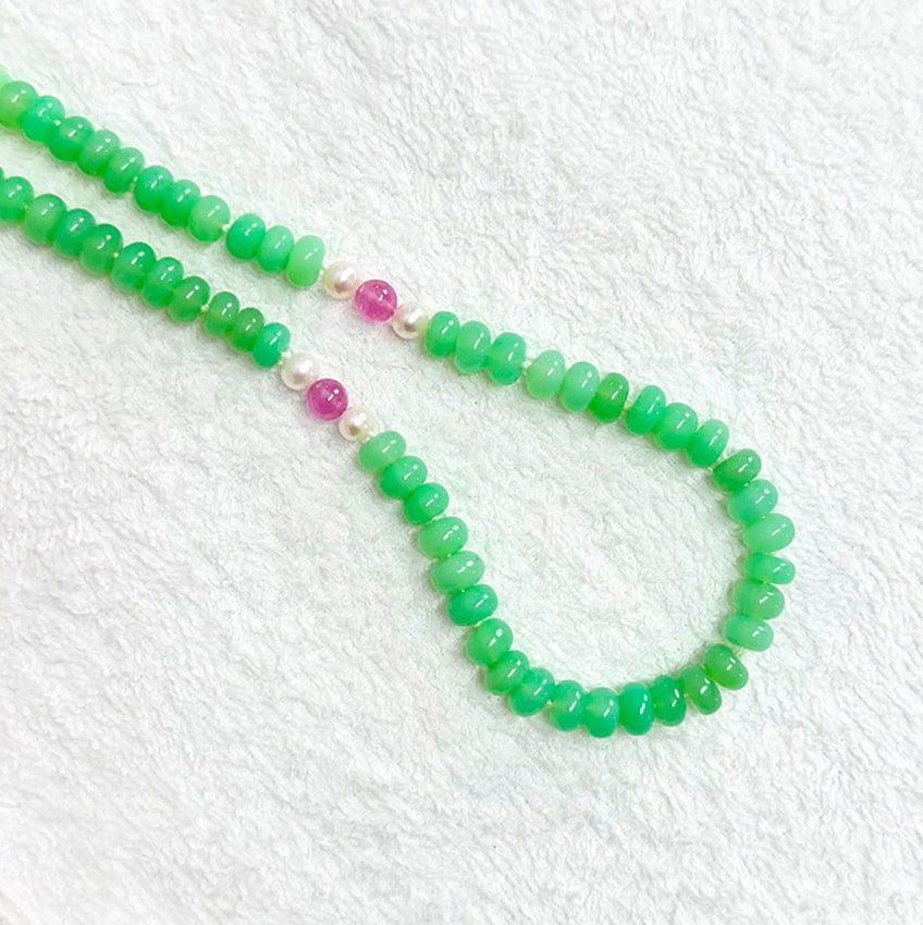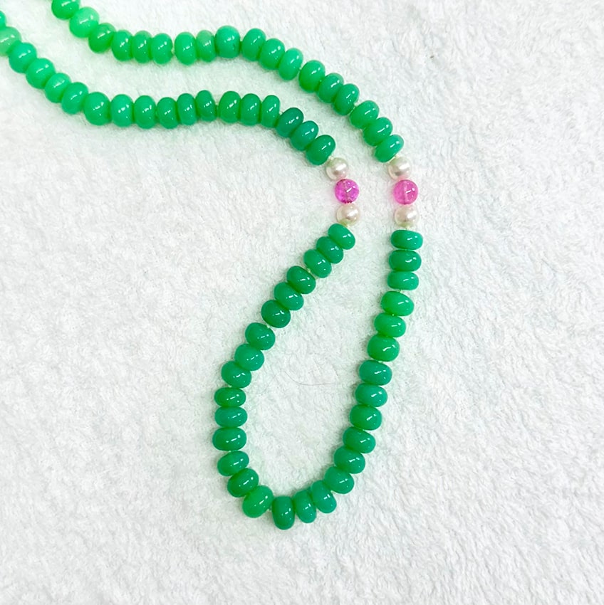 Our Rising Light necklace consists of Chrysoprase, Pink Sapphire, and Freshwater Pearl.